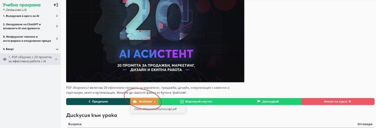 Здравейте защо не успявам да изтегля файловете от третия модул както и сборника с 20 промпта?