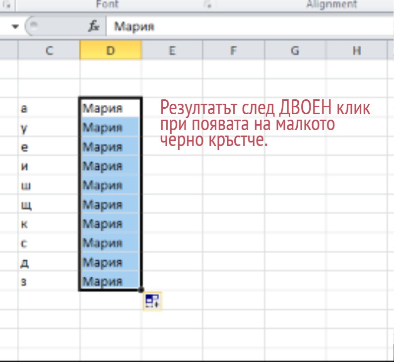Още един начин: в съседна колона напишете надолу, каквото и да е - може цифри, може текст, няма значение, трябва да има нещо написано! Напишете в първата клетка от новата колона това, което е необходимо. Поставете курсора в долния десен ъгъл на клетката и когато той се превърне в малко черно кръстче, кликнете ДВА пъти! Написаното в клетката ще се разпространи до края на предварително написаното в съседната колона.