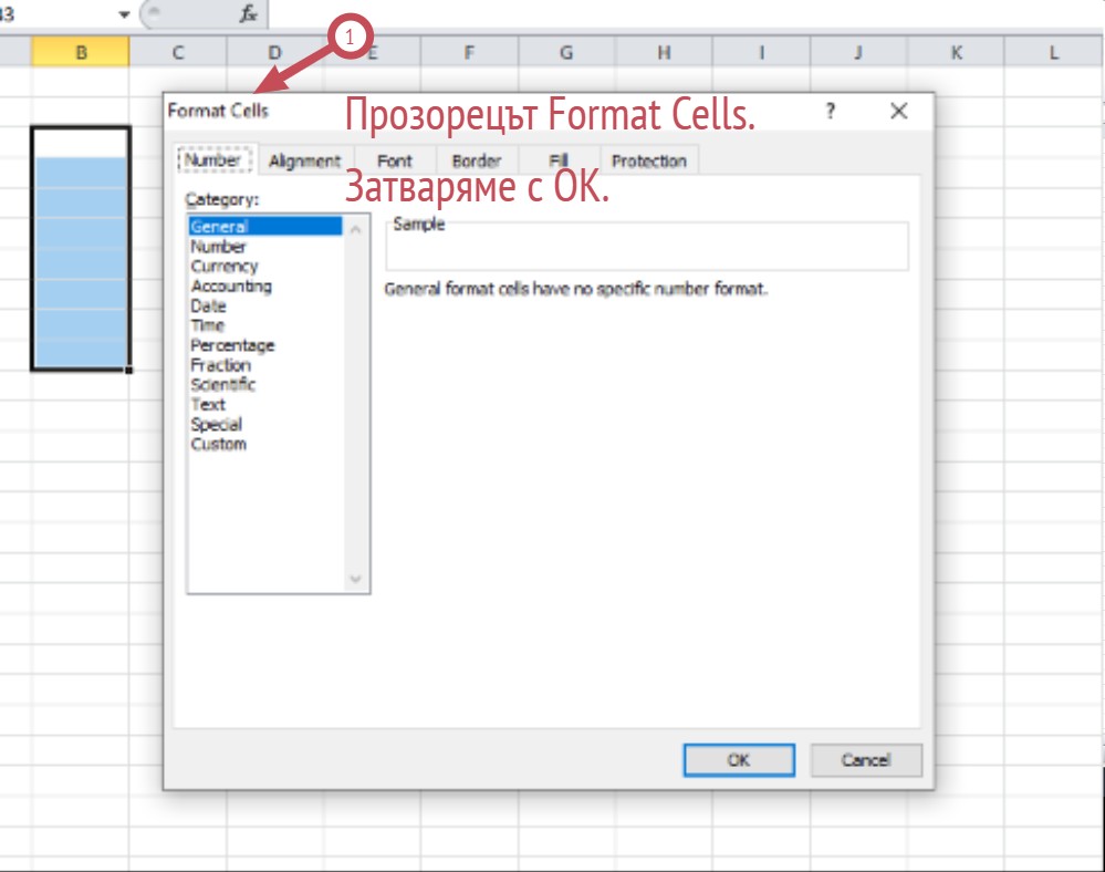 Друг начин: Имаме маркирана клетка/клетки, натискаме ДЕСЕН бутон върху клетката/която и да е/, появява се прозорец от който избираме Format Cells.